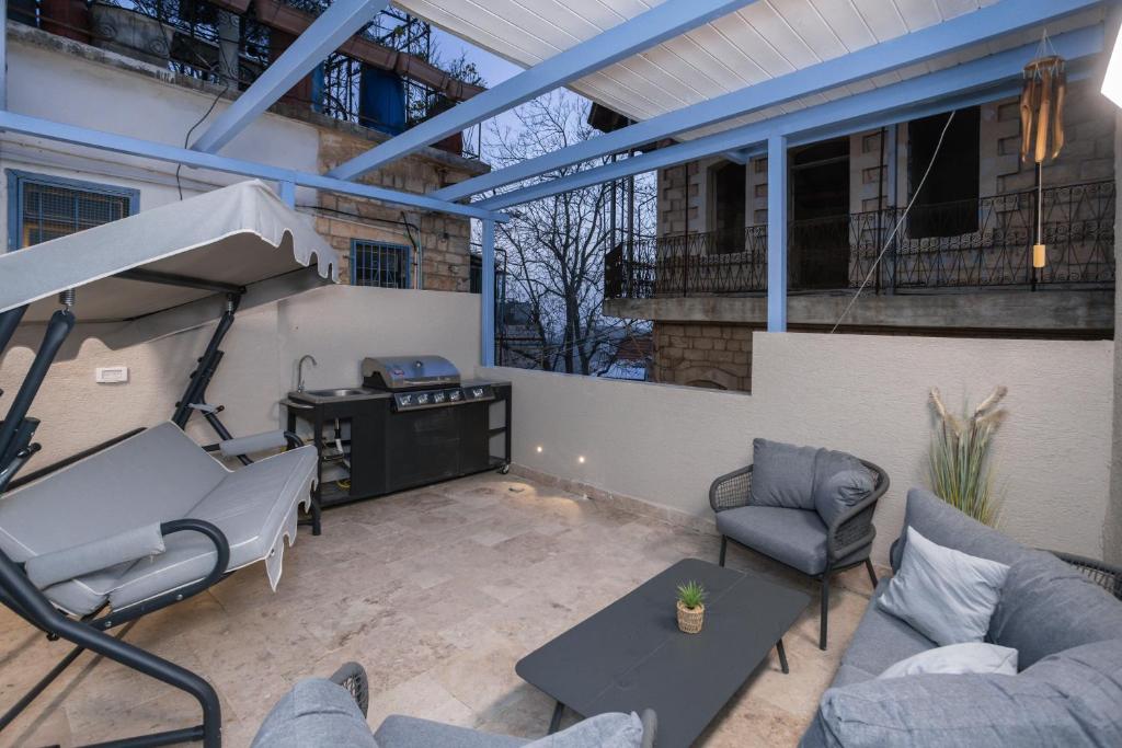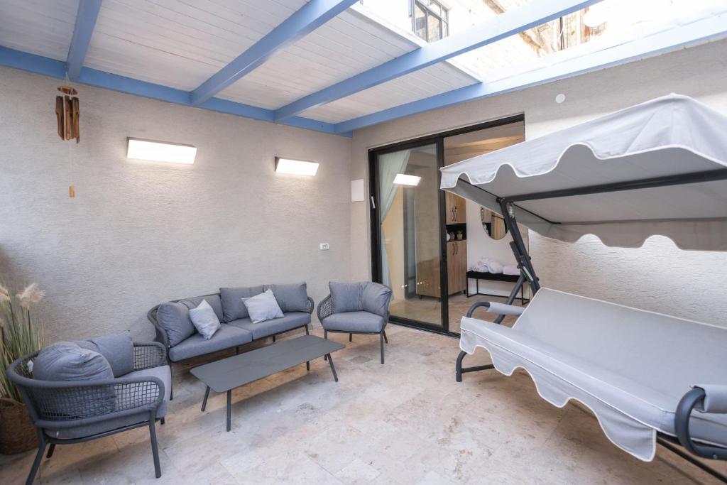 חצר פרטית עם פינת ישיבה ונדנדה מנגל גז ותאורת לילה